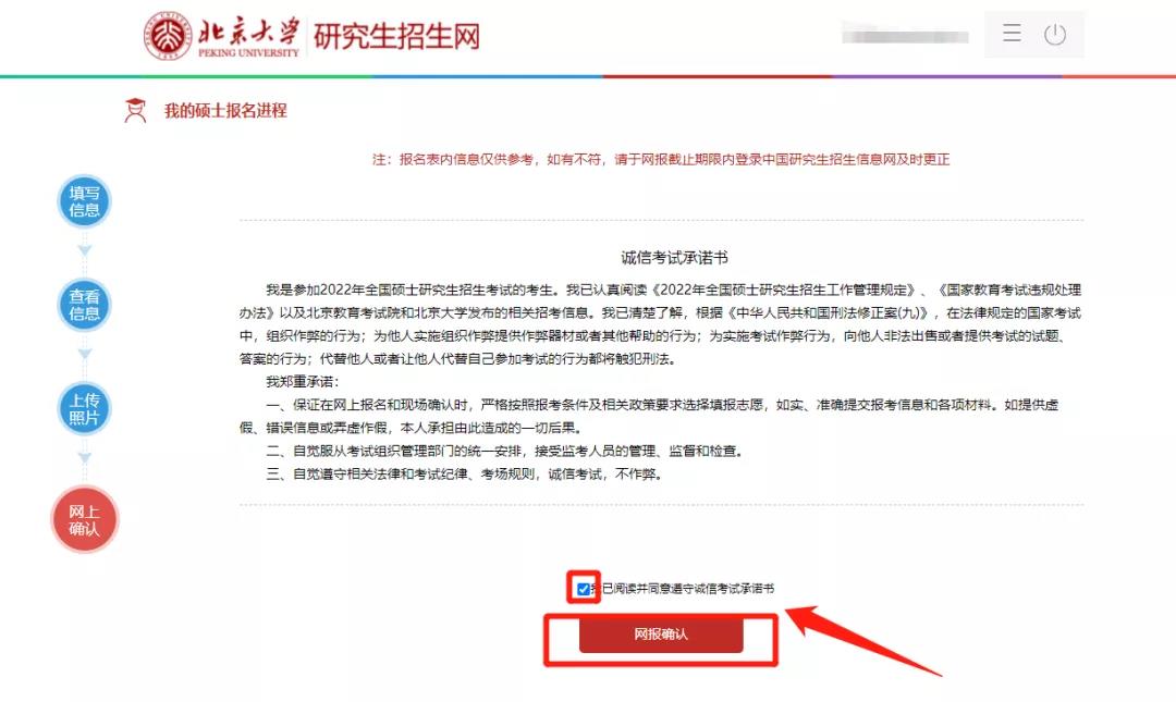 因北京大學報考點不設現場確認,所以需考生在在“北京大學研究生招生網”上確認本人報考信息。 ? 北大研招網確認信息:2020年11月2日10:00至11月5日16:00,逾期不補。 ? 打印準考證:2021年12月18日至2021年12月24日。 ? EMBA聯考筆試(北大本部):2021年12月25日8:30-11:30。 網上確認報考信息 第1步 登錄北京大學研究生招生網,點擊【碩士學位研究生】。 https://admission.pku.edu.cn/ 第2步 請認真閱讀“考試誠信承諾書”,點擊【我已閱讀并同意遵守信靠承諾書】,再點擊【網報確認】。 第3步 當頁面出現“網上確認成功”即可。 北京大學報考點(1101)采取網上確認報考信息的方式。2021年11月2日10:00至11月5日16:00,所有選擇北京大學報考點的考生,均須登錄北大研招網對本人網上報名信息進行認真核對并進行確認。報名信息經考生確認后一律不作修改,因考生填寫錯誤引起的一切后果由其自行承擔。 內容包括: ①網報信息真實準確; ②繳費狀況為“已交費”; ③上傳照片審核結果為“審核通過”; ④學歷(學籍)校驗審核結論為“校驗通過”。網上學歷(學籍)未通過校驗 的考生,須按照第四條學歷(學籍)校驗提供證明材料,方可進行網上確 認; ⑤北京戶籍或北京社保記錄“審核通過”。 以上各項內容均無誤者,點擊“確認信息”進行網上確認。逾期未點擊“確認信息”按鈕進行網上確認,則報名程序未完成,報名無效,不予準考,相關后果考生自行承擔。