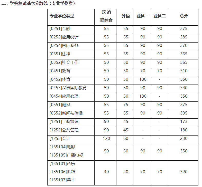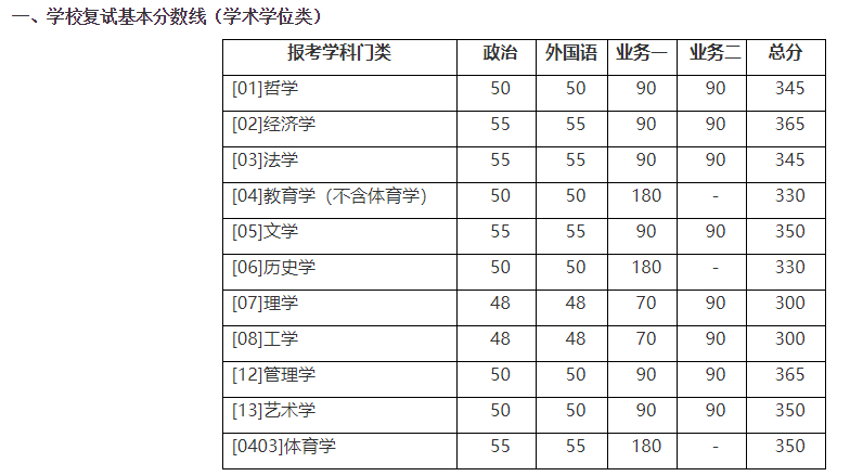 說明:此復(fù)試基本分?jǐn)?shù)線只是我校復(fù)試的最低分?jǐn)?shù)要求,接受報考的學(xué)部院系可根據(jù)整體考試情況、招生計劃、學(xué)科專業(yè)特點等,上調(diào)分?jǐn)?shù)要求。考生須同時達(dá)到學(xué)校復(fù)試基本分?jǐn)?shù)線和報考學(xué)部院系調(diào)整設(shè)定的復(fù)試分?jǐn)?shù)線,才有資格參加復(fù)試。學(xué)部院系調(diào)整設(shè)定的復(fù)試分?jǐn)?shù)線和復(fù)試辦法,另行通知。