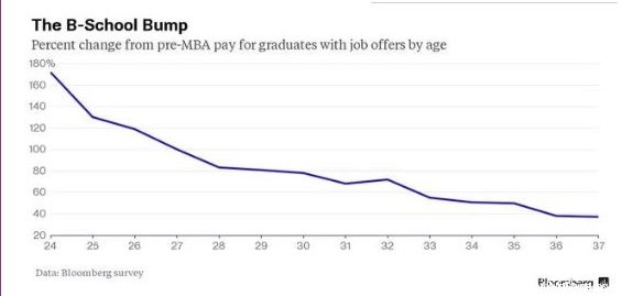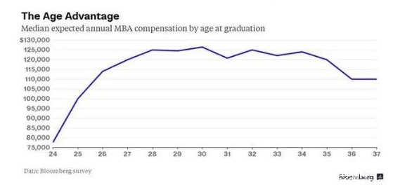 2014年調查了10000名全職MBA畢業生后發現,在30歲之前,得到MBA學位的年紀越大,薪水也就越高。這也能夠解釋的清楚:一個28歲的MBA畢業生比一個24歲的有更多經驗和教育。令人驚奇的是,30歲之后,經驗和教育帶來的優勢迅速下降。