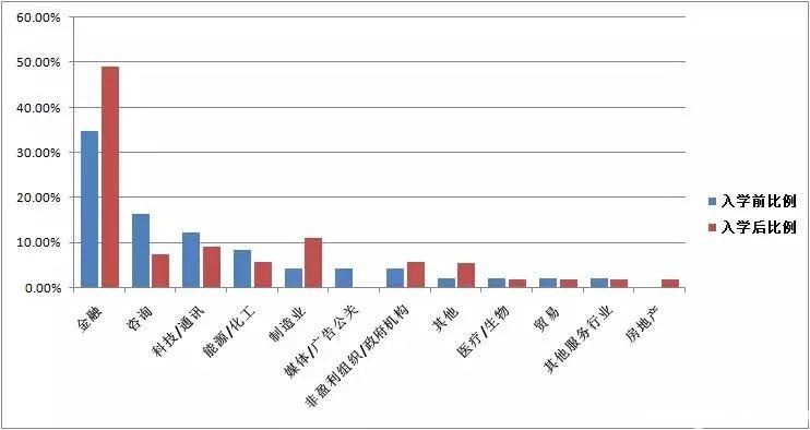 可以看到,金融行業(yè)的就業(yè)比例大幅度增加,這是所有MBA院校的共同特征。