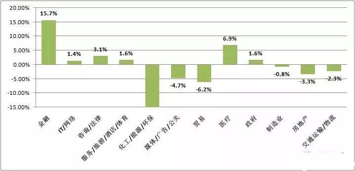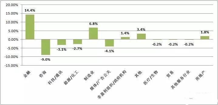 咨詢行業(yè)大幅度下降,這一點(diǎn)出乎很多同學(xué)的意料。不過這里并未給出具體就業(yè)單位的情況,也許高端咨詢公司的就業(yè)比例變化會有所不同。
