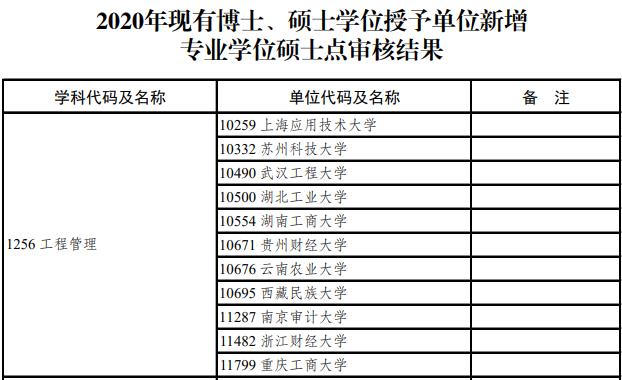 根據《2020年現有博士、碩士學位授予單位新增專業學位碩士點審核結果》得知,新增13所MEM培養院校。