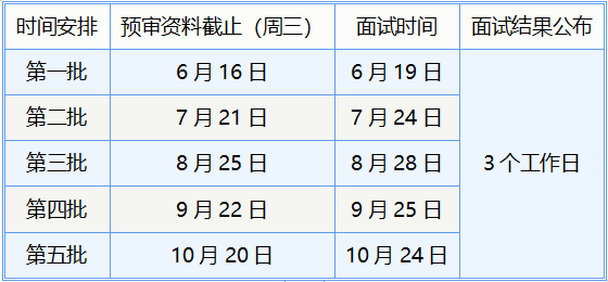 ① 報名表格及申請材料提交時間為每個批次面試前兩天截止,否則請參加下次面試。
