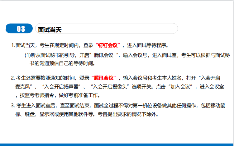 (二)面試方式:采取網絡遠程面試方式??忌玫谝粰C位設備登錄騰訊會議,參加視頻面試;第二機位設備接入釘釘-會議,接受云監考。