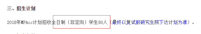 這是對外經濟貿易大學2018年MPAcc的招生簡章(上次有同學留言提到了的),去年的招生計劃是“全日制50人,非全日制93人”。全日制的招生計劃沒有改變,非全日制的倒是減少了。