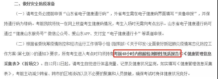 山東省教育招生考試辦發布的22考研考生須知中明確了“所有考生進入考點時均須持有考前48小時內核酸檢測陰性紙質報告和《健康管理信息采集表》(首場交)”。