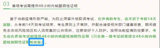所有考生(包括校內考生和社會考生)應在第一場考試進入考點時提供48小時內(12月23日08:30以后采樣)核酸檢測陰性證明的紙質版,考場內收取。
