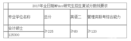 在教育部公布的《2017年全國碩士研究生招生考試考生進入復試的初試成績基本要求》的基礎上,廈門國家會計學院根據2017年會計專業碩士研究生(MPAcc)招生計劃數,采取1:1.5差額復試,確定復試分數線如下(見下面表格)。廈門國家會計學院2017年全日制MPAcc研究生招生計劃為80人(含1名推免生),非全日制MPAcc研究生招生計劃為30人。