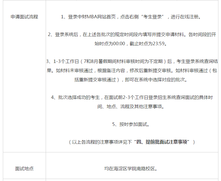 4、關于學習方式:全日制和非全日制的選擇:考生在提前批申請材料中,必須選擇學習方式,且必須與通過中國研究生招生信息網(簡稱研招網,教育部指定網站)報名時(一般在10月)選擇的學習方式一致。即,在提前批選擇了全日制,在研招網報名時也必須選擇全日制,非全日制同理。如果不一致,已經取得的A類預錄取資格降為B類預錄取資格;已經取得的B類預錄取資格降為無提前批面試成績,只能在聯考成績達到中財MBA復試分數線后,參加正常批復試。