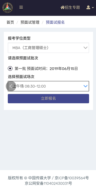 第四步:點(diǎn)擊“預(yù)面試報(bào)名”,選擇“學(xué)位類(lèi)型、批次、場(chǎng)次”,提交信息,報(bào)名成功!
