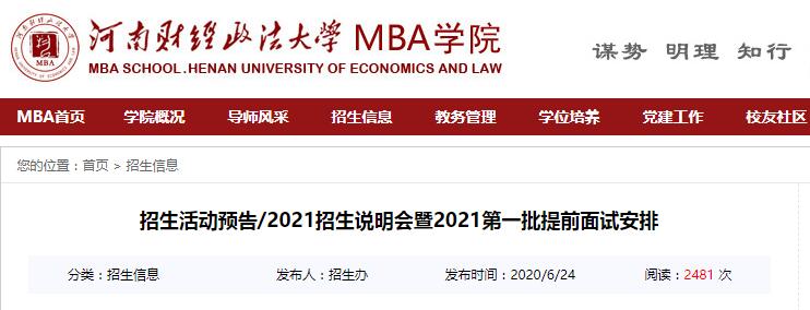 “河南財經政法大學2021MBA招生說明會” 暨2021第一批提前面試將于2020年7月18日舉行,敬請關注!