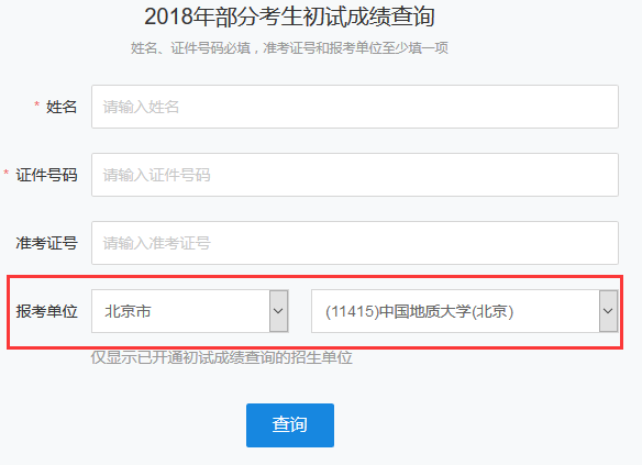 以下是中國地質(zhì)大學(北京),2018年全國碩士研究生考試成績查詢?nèi)肟?/span>(https://yz.chsi.com.cn/apply/cjcx/)