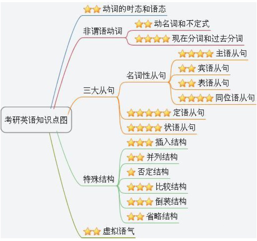 通過上圖的統計數據,我們不難發現:非謂語動詞、虛擬語氣、倒裝結構、各種從句、比較結構這幾種主要語法知識點都以或高或低的頻率出現在歷年真題的直接命題點處。其中,語法點的考查頻率始終位于前兩位的分別是三大從句和非謂語動詞,由此我們可明確得出結論:從句和非謂語形式是語法知識點中的首要考查點,所以,我們應該給予足夠的重視。除此之外,比較結構、否定結構、倒裝結構、虛擬語氣等出現的頻次雖然較少,但一旦出現,往往也是考點和直接命題點,所以,我們總結考研語法知識體系如下: