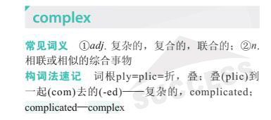 導(dǎo)讀:本期單詞complex ( adj 復(fù)雜的,復(fù)合的,聯(lián)合的;n 相聯(lián)或相似的綜合事物)