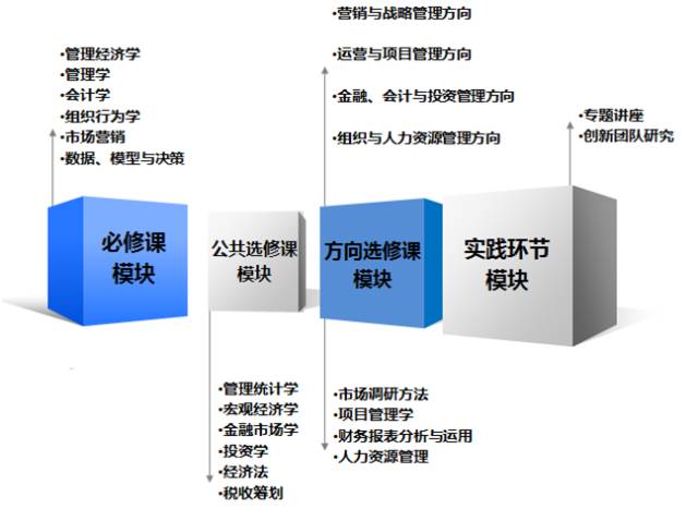⊙特色模塊設置:四大模塊——營銷與戰略管理,運營與項目管理,金融、會計與投資管理,組織與人力資源管理