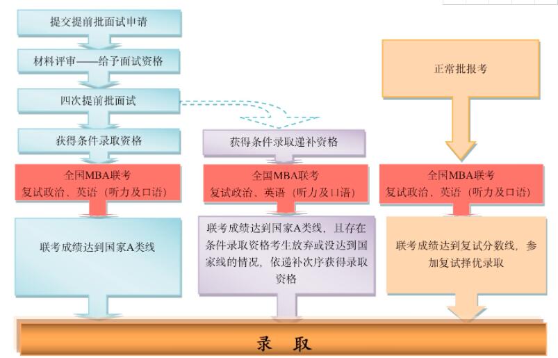 登錄中國(guó)人民大學(xué)商學(xué)院MBA項(xiàng)目中心網(wǎng)站“考生服務(wù)系統(tǒng)”,按照規(guī)定時(shí)間提交網(wǎng)上申請(qǐng)材料,學(xué)院將組織專家評(píng)審申請(qǐng)材料,擇優(yōu)給予提前面試資格并組織面試。面試后獲得條件錄取資格和條件錄取遞補(bǔ)資格的考生需參加2019年12月底舉行的全國(guó)聯(lián)考。