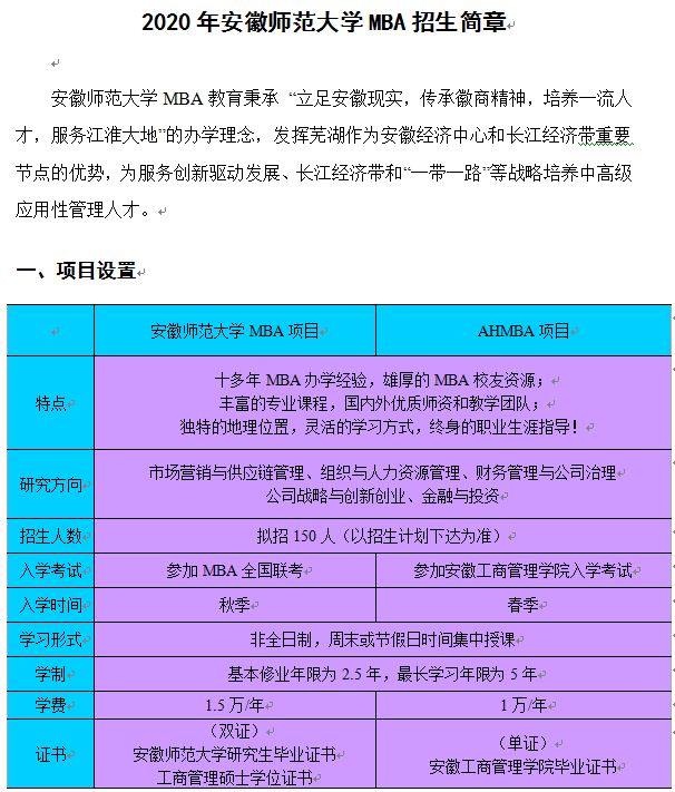今天小編給大家整理的是“2020年安徽師范大學(xué)MBA(工商管理)招生簡(jiǎn)章”的相關(guān)內(nèi)容,有報(bào)考意愿的小伙伴要注意下哦!